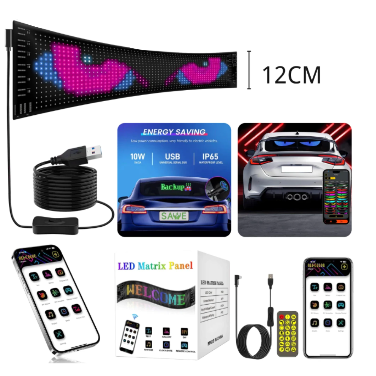 - Pantalla LED Flexible: El panel es flexible, permitiendo una fácil instalación en superficies curvas o irregulares de tu vehículo.