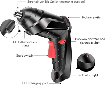 Facilita tus tareas de bricolaje y mantenimiento con este destornillador eléctrico de diseño ergonómico, que ofrece un agarre cómodo y un manejo sencillo para trabajar con mayor precisión y menos esfuerzo.