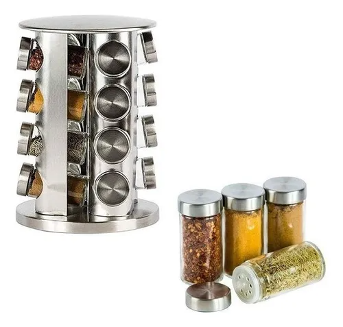Organiza tus especias favoritas con estilo gracias a este set condimentero giratorio de 16 frascos. Su diseño moderno en acero inoxidable no solo aporta elegancia a tu cocina, sino que también mantiene tus condimentos siempre a la mano y perfectamente ordenados.