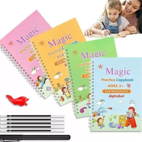 Incluye 4 cuadernos mágicos, un bolígrafo borrable 🖊️ con recambios y un corrector de agarre ✋, ideal para mejorar la postura al escribir.